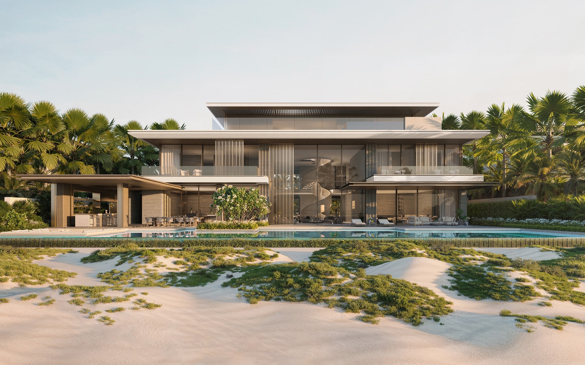 Les résidents profitent d’un large éventail de prestations : accès direct à la plage, pavillon et salon résidentiel, piscines et pool bar, spa, studio de yoga et de méditation, centre de fitness, courts de tennis et de padel, espaces de jeux pour enfants intérieurs et extérieurs, cinéma privé, salle de jeux, simulateur de golf, lounge à cigares, salle de réunion et installations pour événements privés. Les services incluent conciergerie, sécurité 24h/24, valet parking, entretien, et une gamme de services à la carte allant du ménage à la garde d’enfants ou aux soins bien-être à domicile.