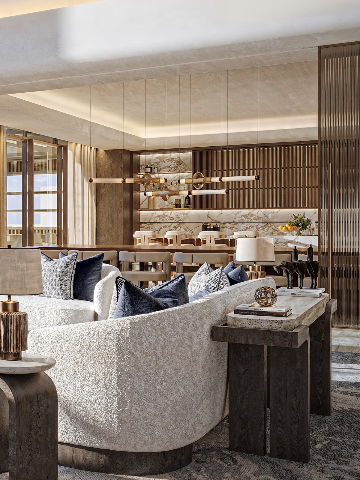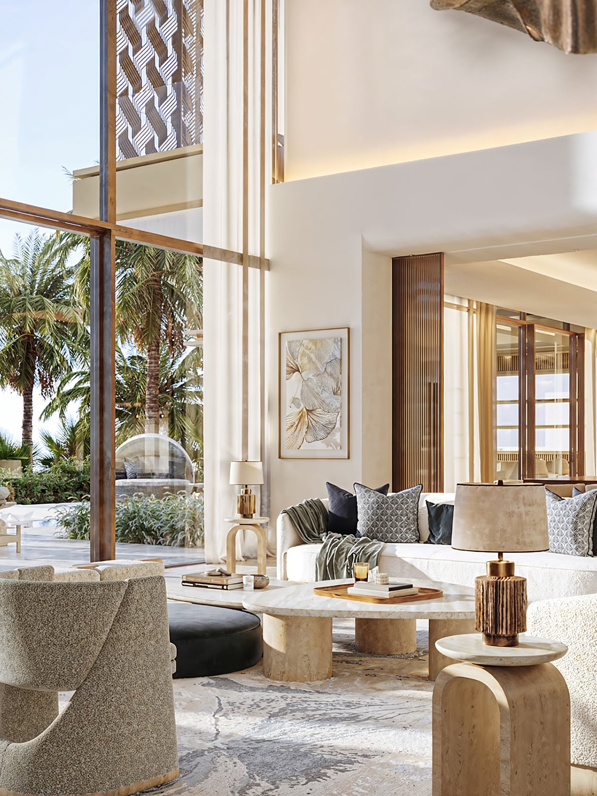Imaginé par Killa Design, cabinet d’architecture reconnu pour ses projets emblématiques et durables, le design du bâtiment s’inspire des courbes naturelles de la plage de Saadiyat. Les façades, aux lignes douces et organiques, rappellent le mouvement des vagues. Les matériaux utilisés — marbre, travertin, bois noble et métaux patinés — traduisent une élégance subtile et intemporelle. L’ensemble évoque un équilibre entre modernité, confort et intégration paysagère, où chaque espace a été pensé pour refléter la sérénité du littoral.