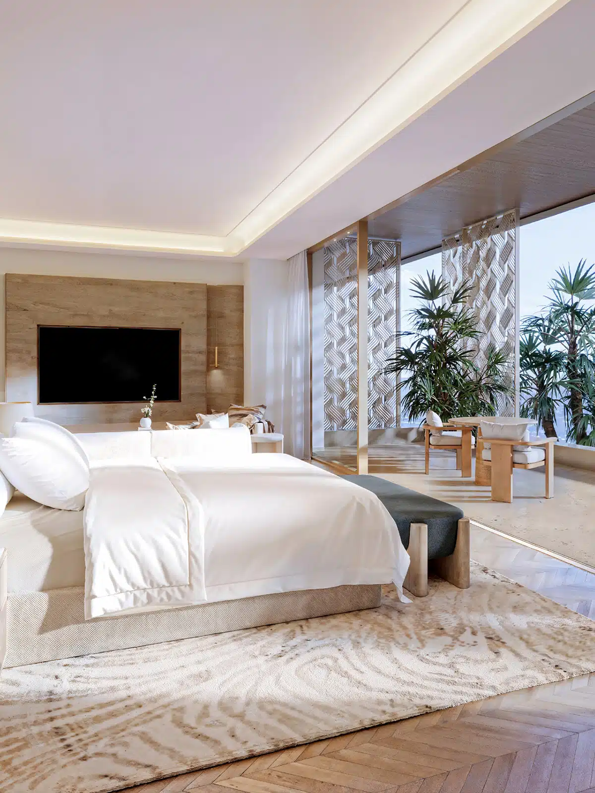 Les appartements et villas offrent des volumes généreux, baignés de lumière naturelle grâce à de larges ouvertures sur la mer et les jardins. Chaque logement se distingue par un haut niveau de finition : cuisines Molteni équipées d’appareils Gaggenau, salles de bain signées Gessi et Agape, éclairage intelligent Lutron, et rangements sur mesure Molteni & MisuraEmme. Deux palettes d’intérieurs – “Light” et “Semi-Dark” – permettent d’adapter l’ambiance à ses préférences, entre clarté contemporaine et contraste raffiné.