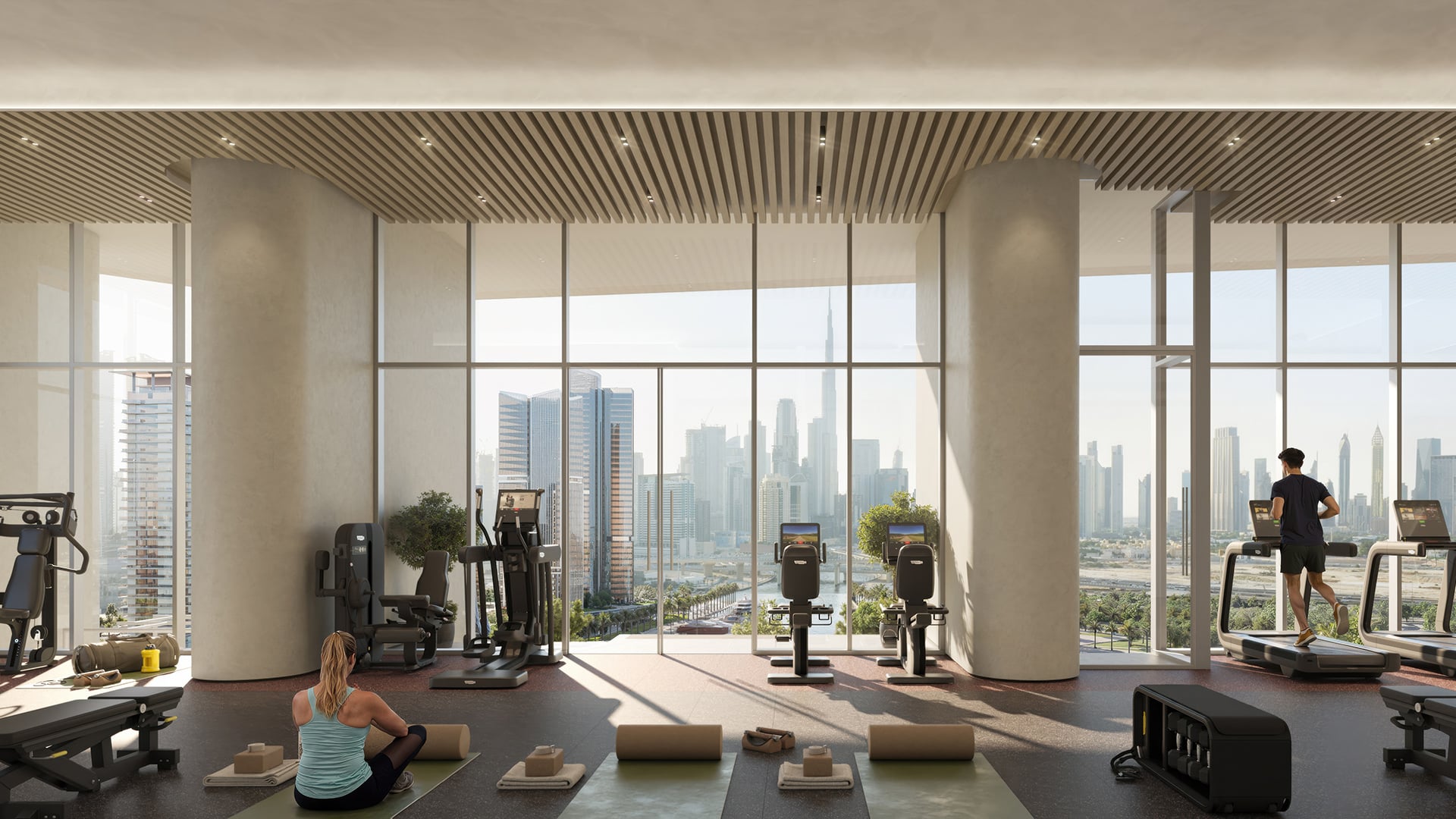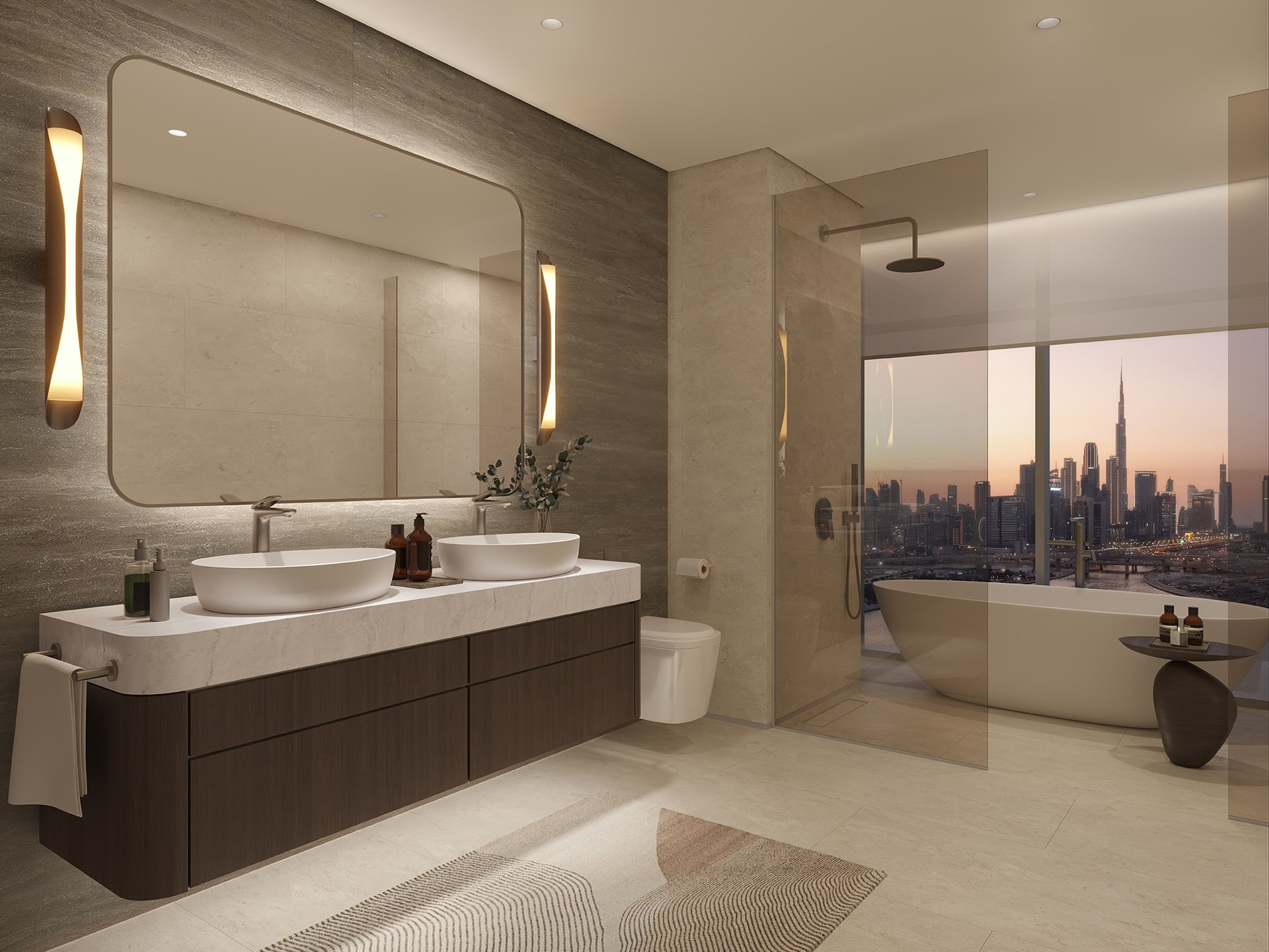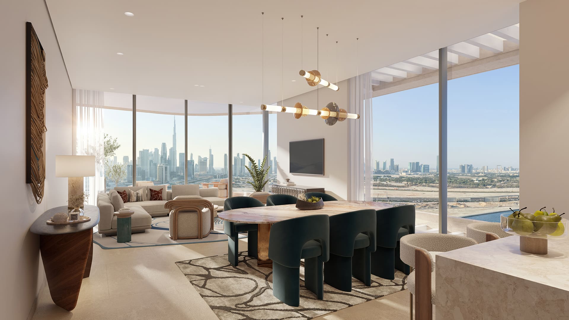 The architecture employs purposeful lines, sculptural balconies, and full-height glazing that frames panoramic views of the Burj Khalifa skyline and the Dubai Canal. Interiors feature a curated palette of materials and refined detailing, celebrating a design philosophy where form, clarity, and craftsmanship converge to create a distinct residential experience.