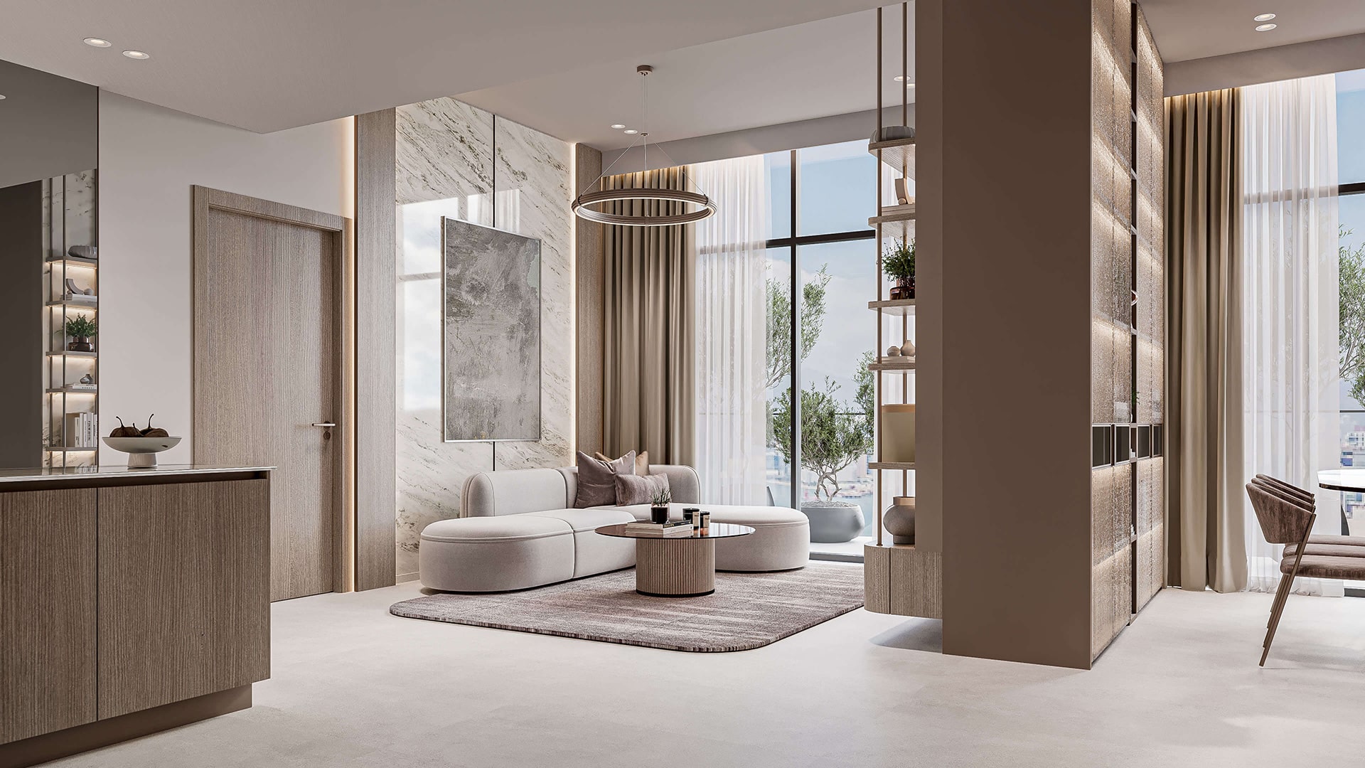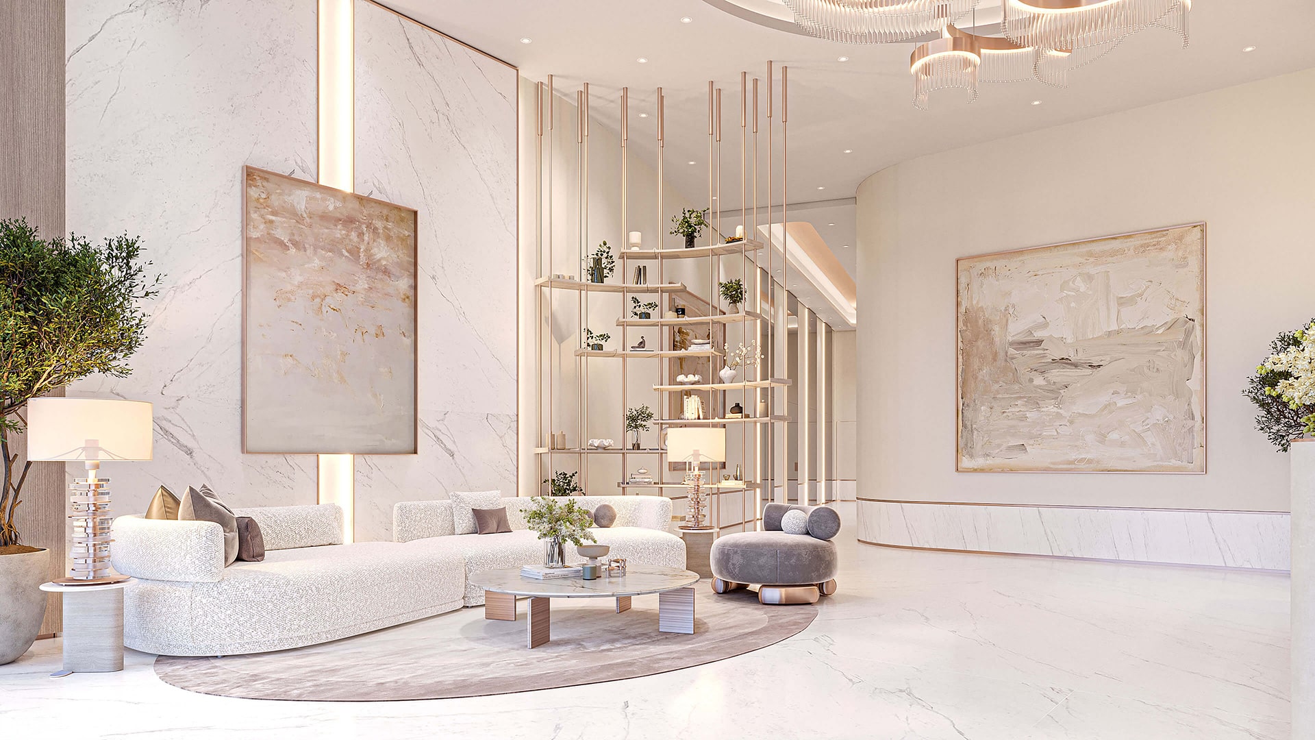 Cybele showcases a distinctive architectural language marked by rounded terraces, soft lines, and layered façades shaped for park-facing living. Generous glazing enhances natural light, while materials in muted tones create a calm, elegant aesthetic. The interiors and communal areas reflect careful craftsmanship, highlighted by stone textures, timber elements, and warm lighting that emphasize a harmonious and composed arrival experience.
