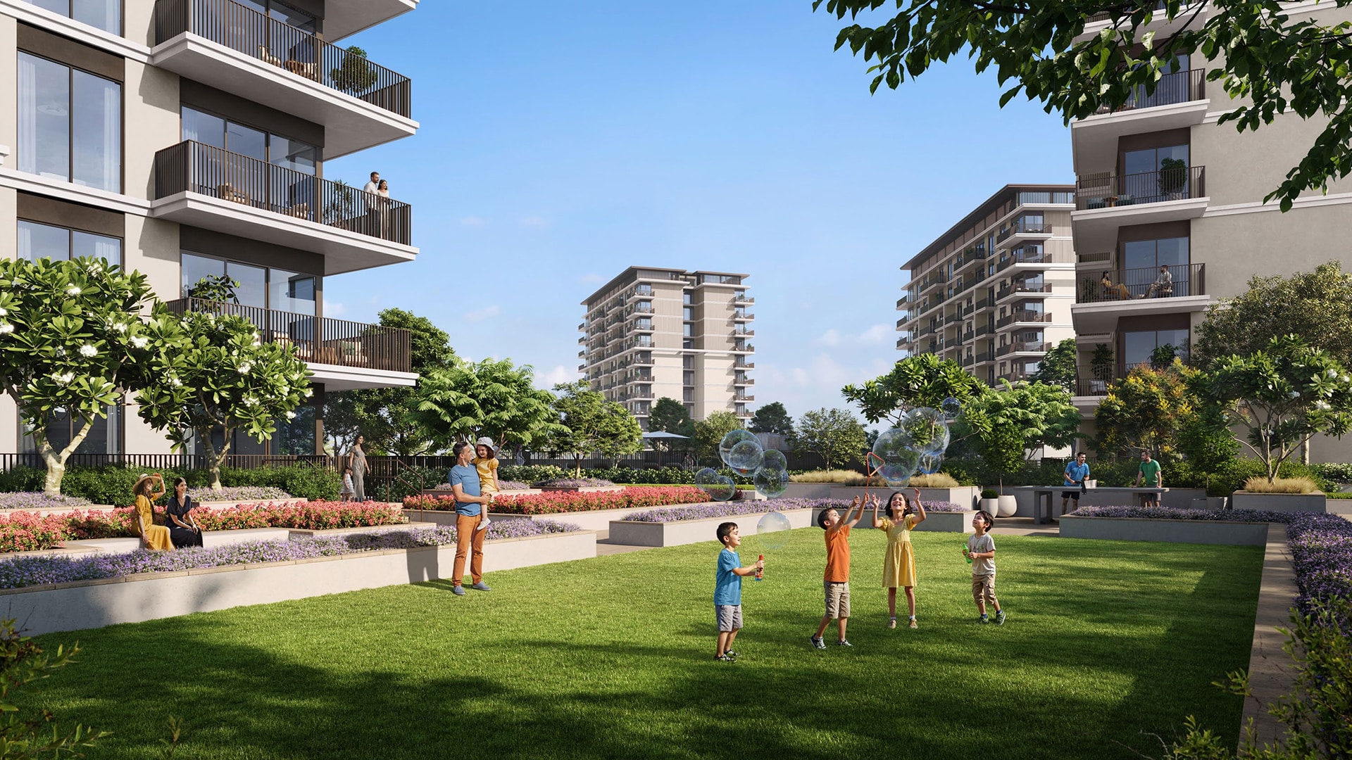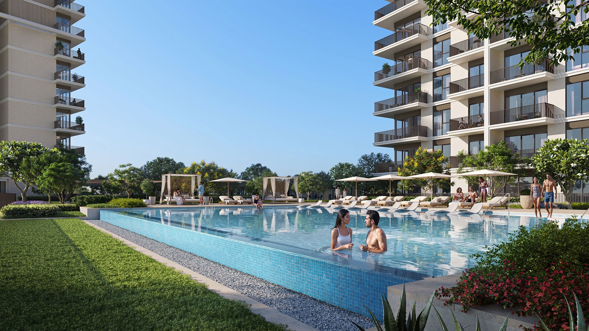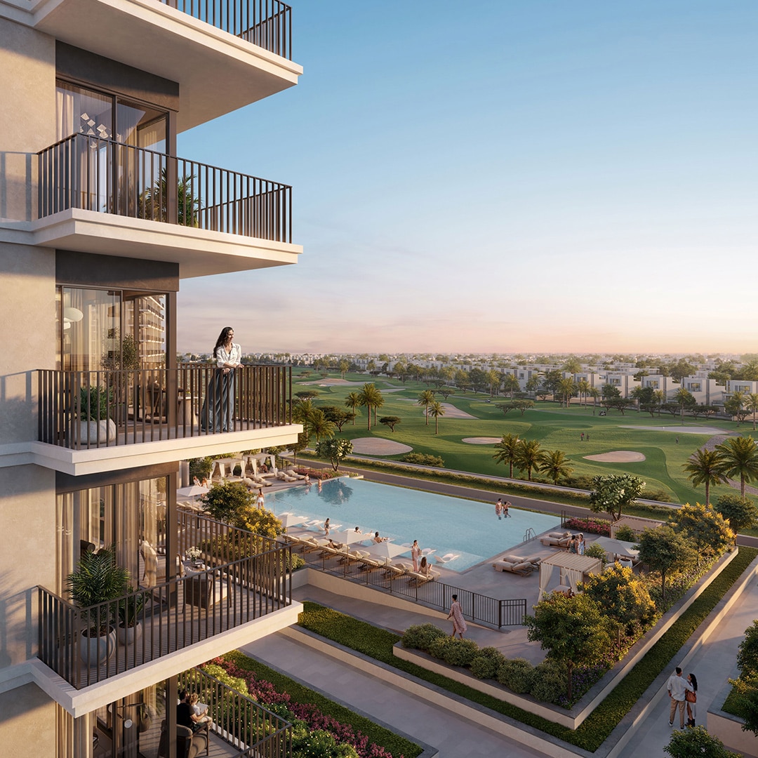 The architecture reflects contemporary design principles with clean lines, open balconies, and thoughtful proportions. Buildings are arranged to maximize views of landscaped gardens and the golf course, allowing light, openness, and nature to shape the residential experience. Material choices emphasize durability, elegance, and understated sophistication.