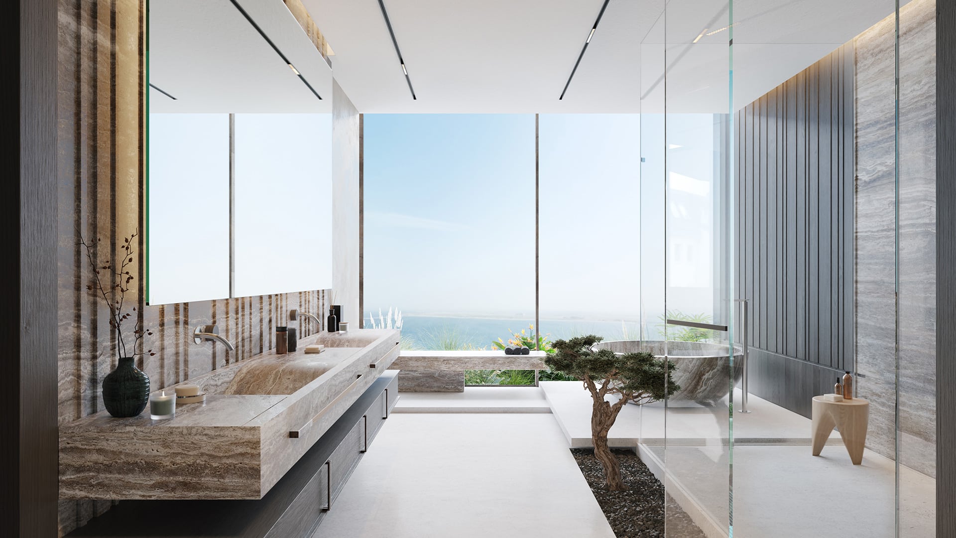 The residences embody understated luxury through light-filled spaces, panoramic sea views, and ergonomic layouts that foster both comfort and style. Floor-to-ceiling windows invite natural light and frame captivating views of the coastline. Interiors include open-plan living areas, elegant kitchens with concealed grease zones, and tranquil terraces that extend the sense of space. Every detail — from Alcantara beige fabrics to bronze accents — enhances the feeling of serenity and balance, ensuring a refined living experience.