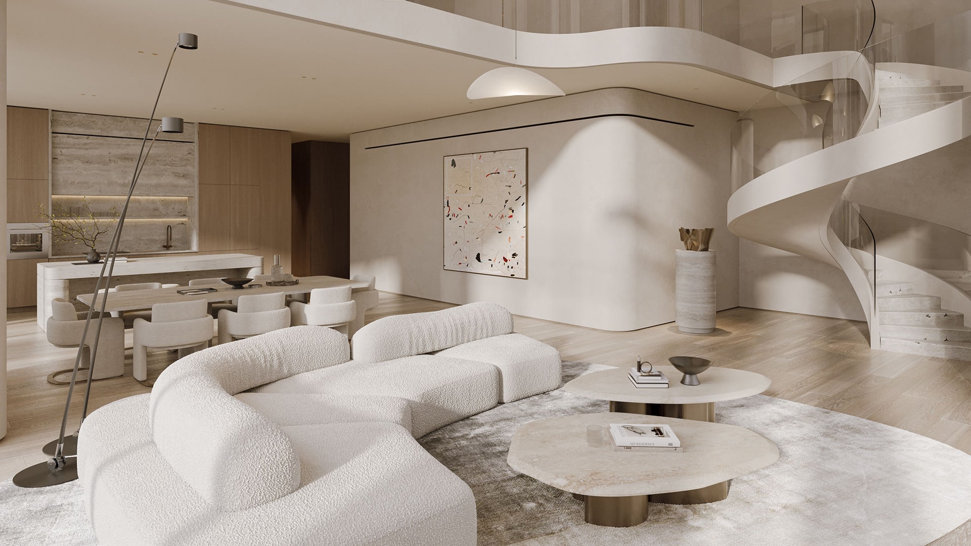 SAAS Hills showcases an architectural identity built on fluid, contemporary lines that flow from the exterior façade into the interior spaces. Each tower features an elegant, curved silhouette, creating a visually iconic presence. The communal areas, including the spacious lobby and sculptural passageways, highlight refined materials, natural light, and meticulous detailing. The overall design reflects high construction standards and a commitment to durability and elegance.