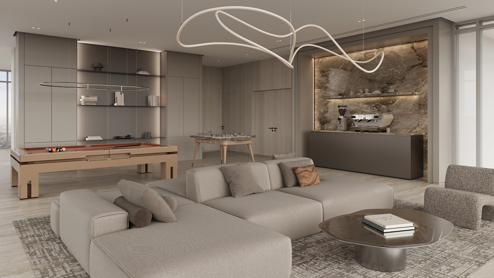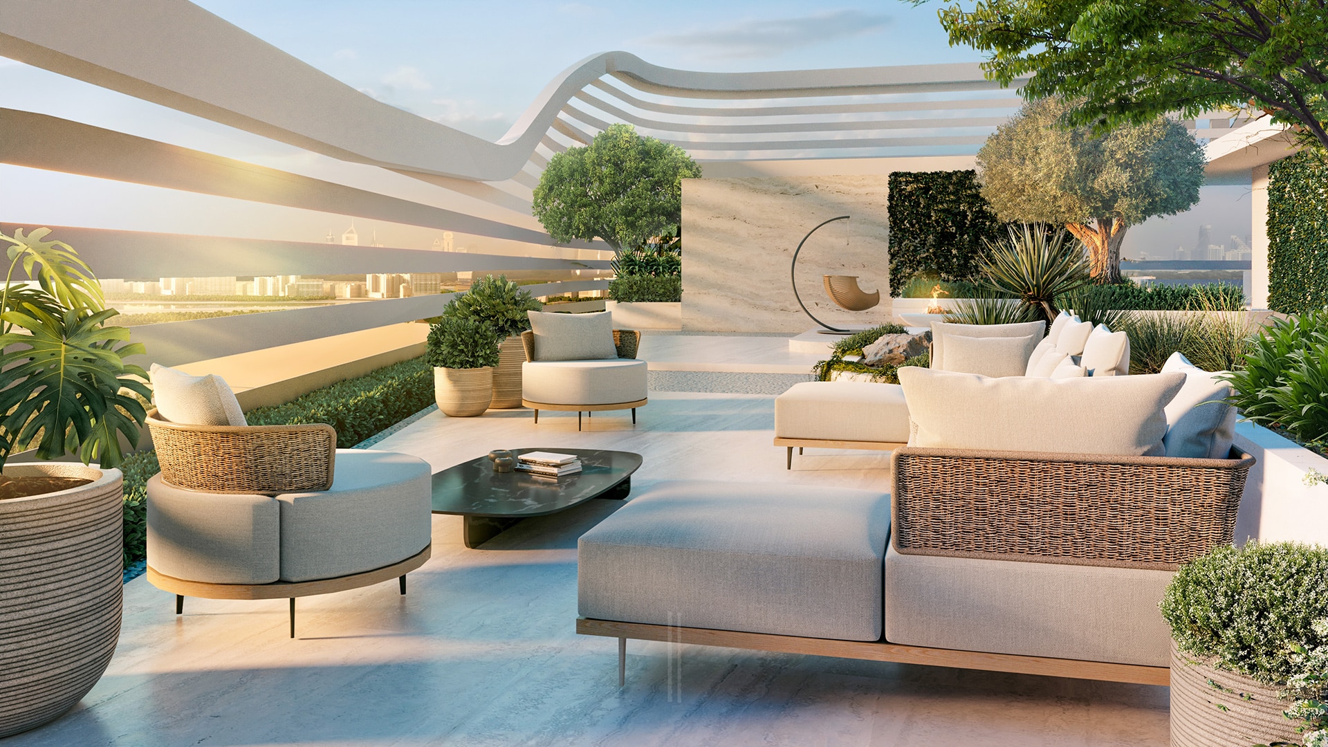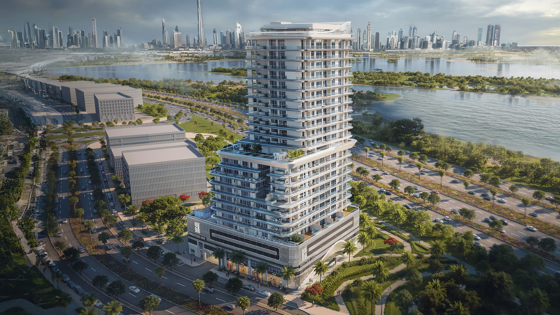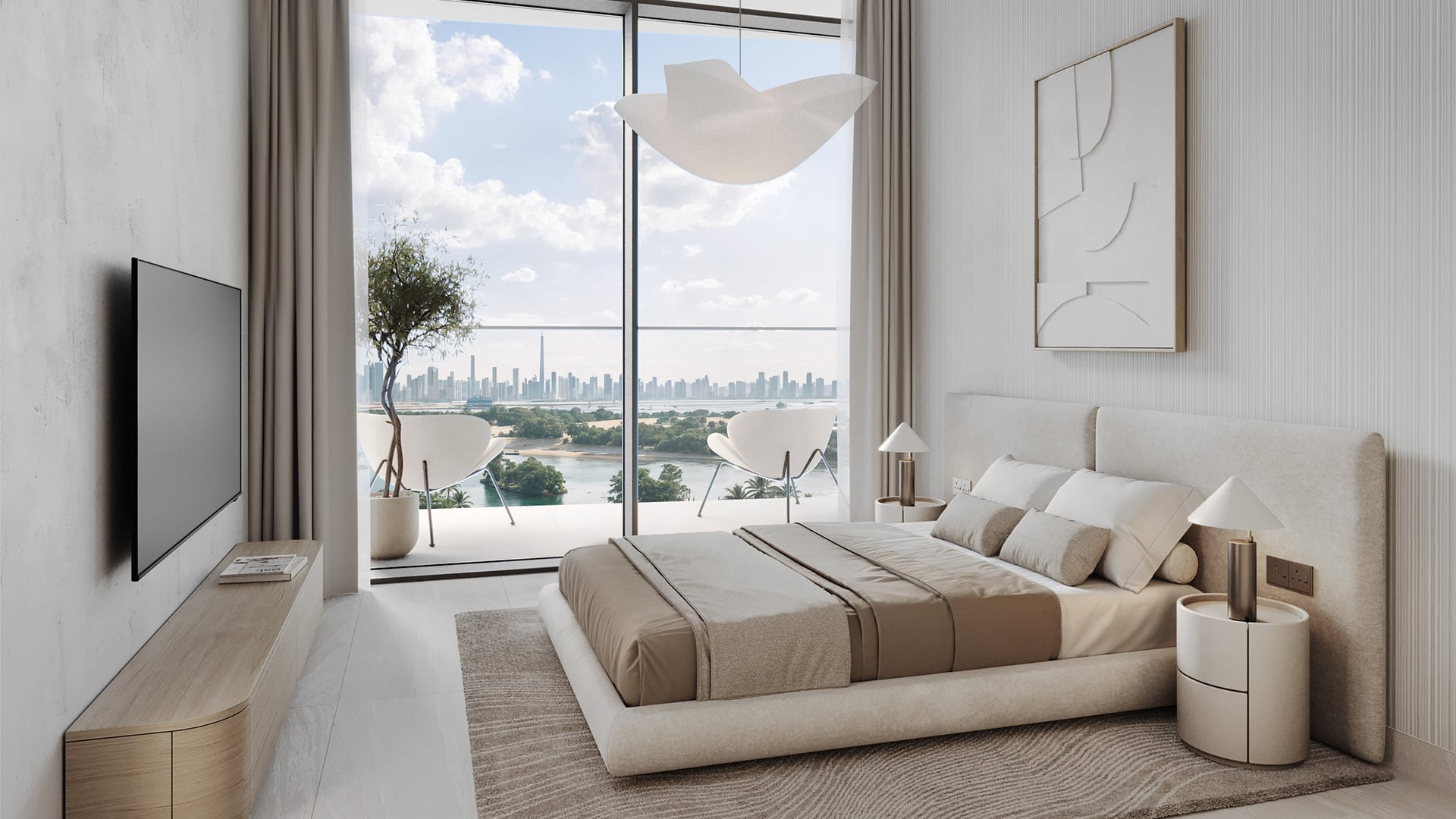 The tower features a sculptural façade defined by flowing lines, generous terraces, and carefully articulated volumes. Transparency and light play a central role in the design, allowing interiors to open toward panoramic views. The architectural expression balances contemporary luxury with a calm, organic presence inspired by the surrounding landscape.