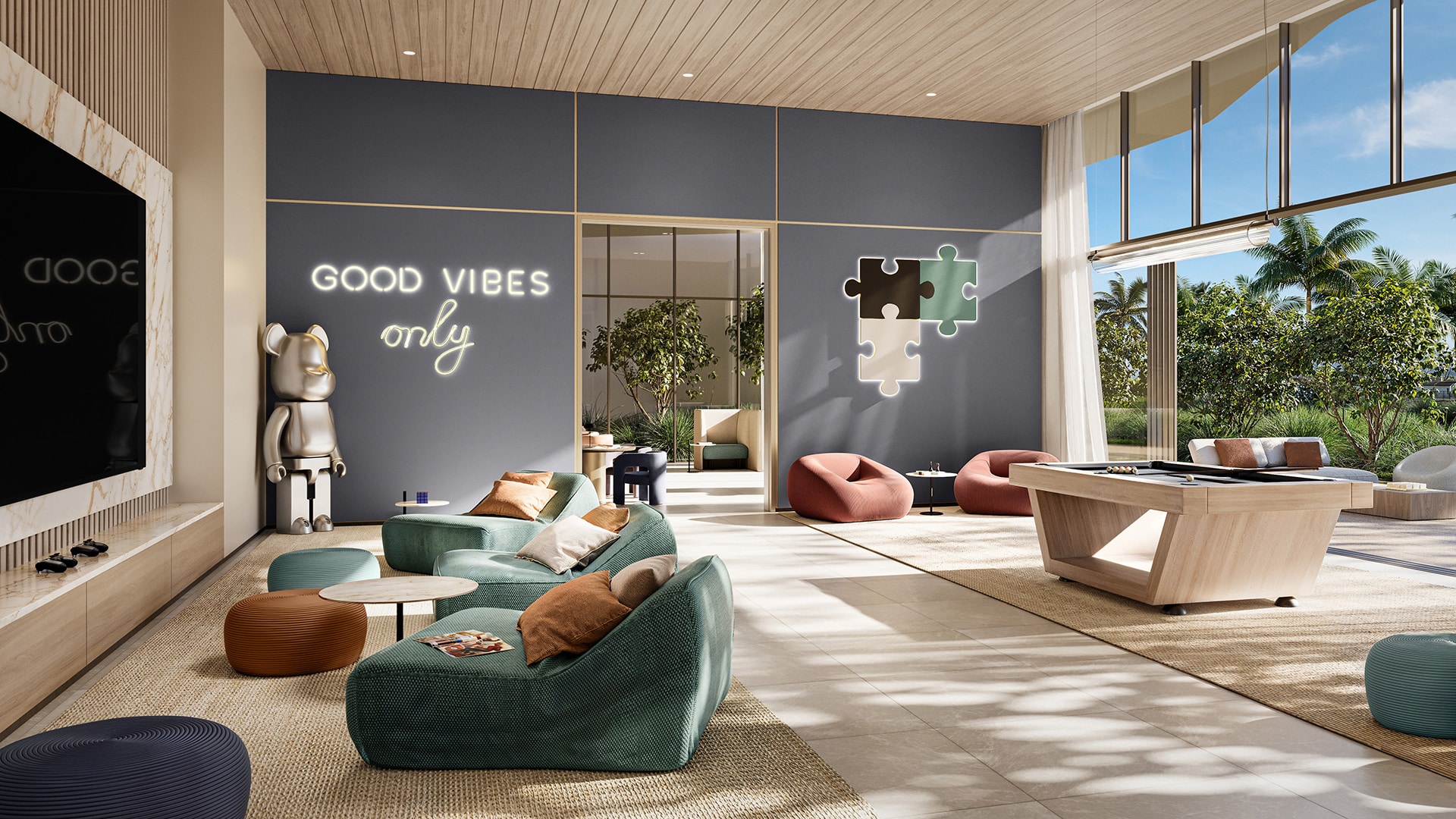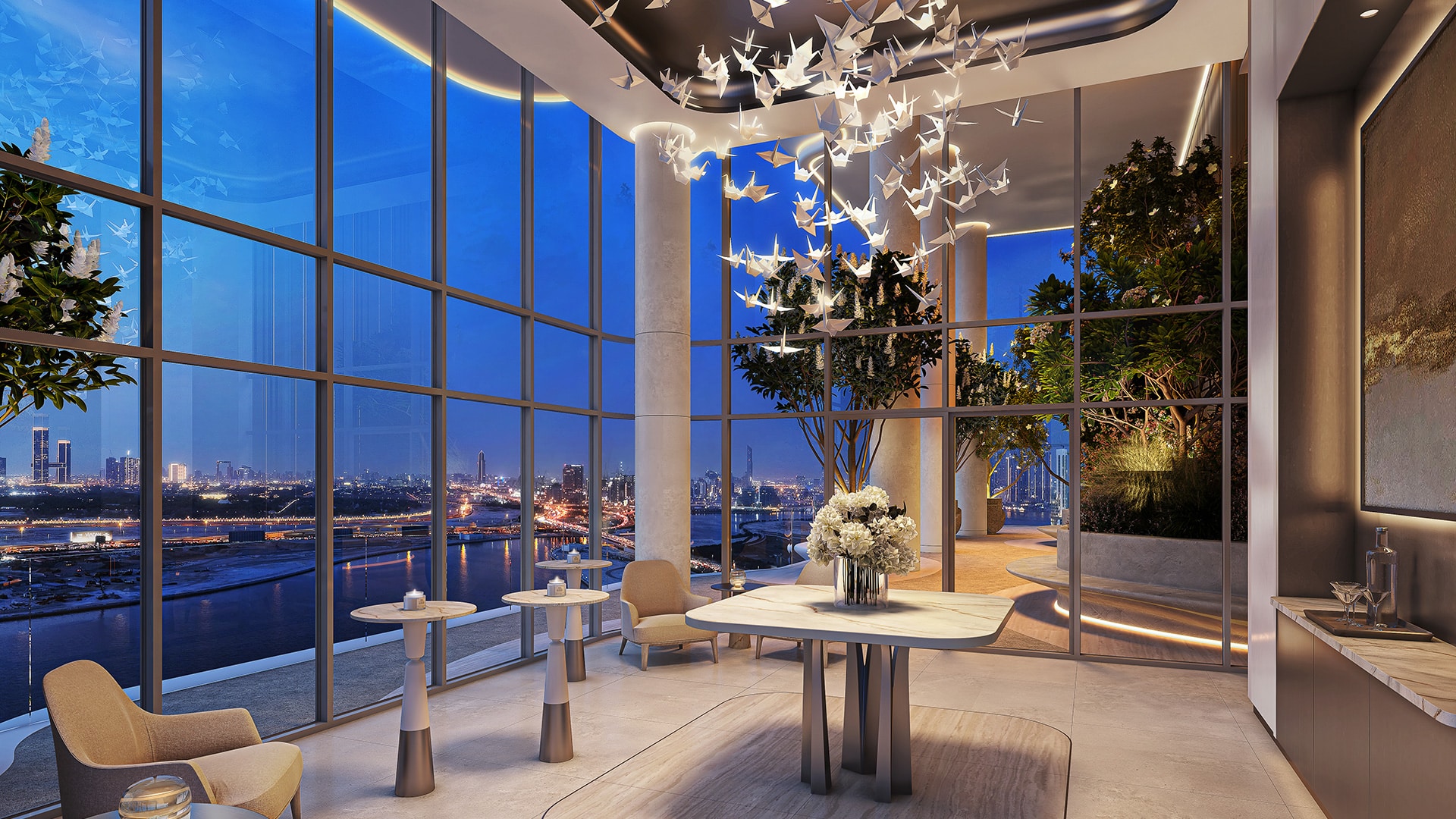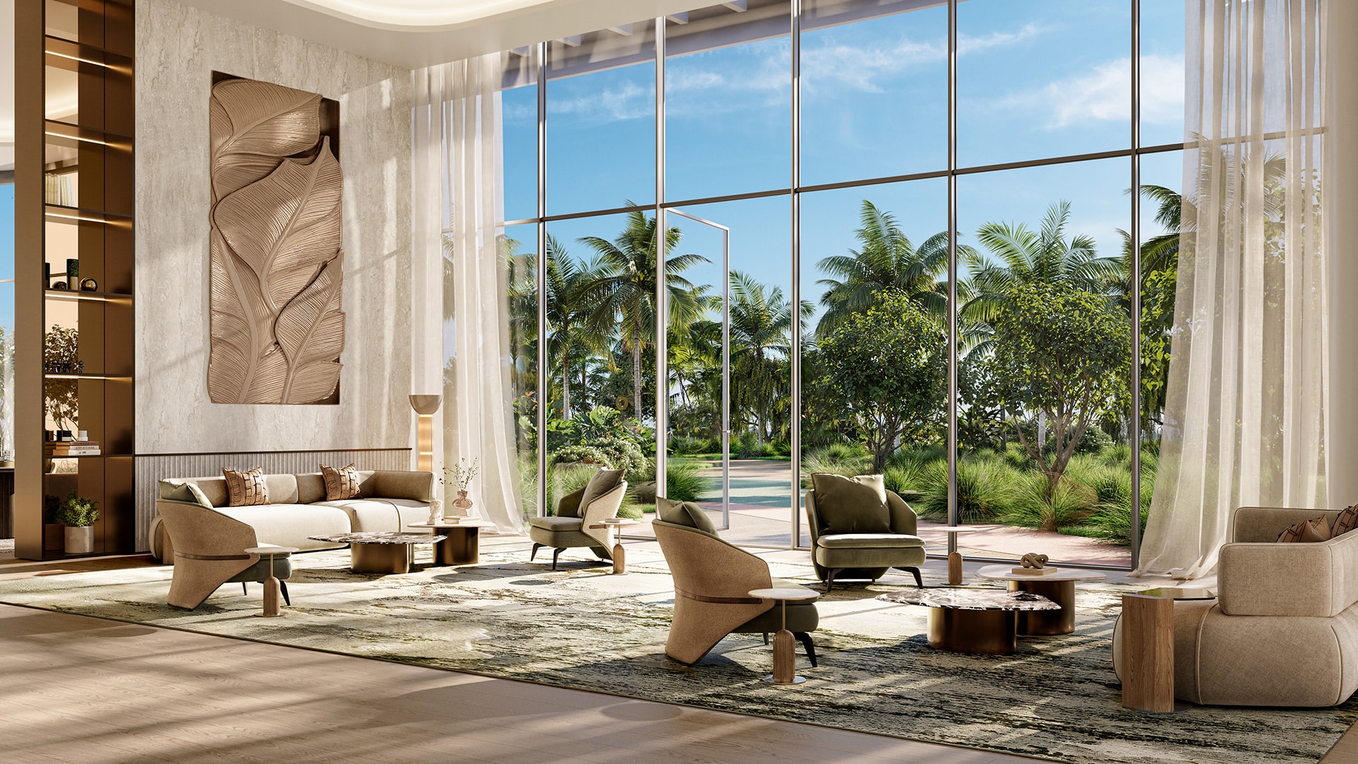 Amenities include double-height lobbies, co-working and gallery spaces, family lounges, events lounges, landscaped sky gardens, cabanas, BBQ areas, indoor and outdoor gyms, yoga and wellness studios, padel courts, cinema room, kids’ and teenagers’ clubs, reading and quiet rooms, resort-style pools, lap pools, kids’ pools and outdoor play areas. The towers are interconnected for seamless access to all facilities.