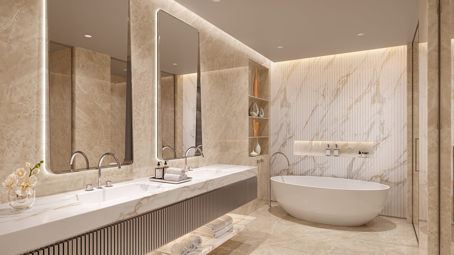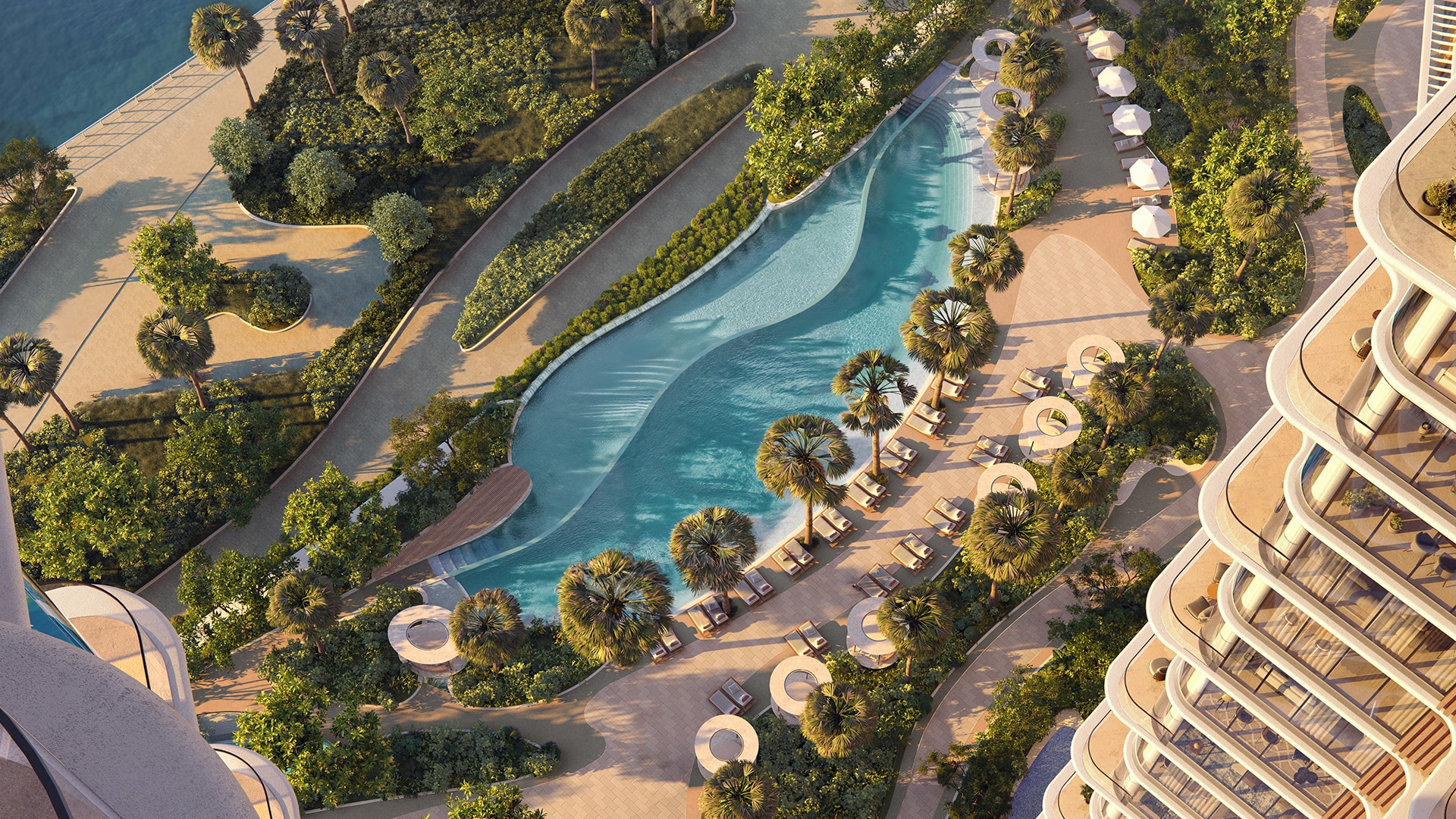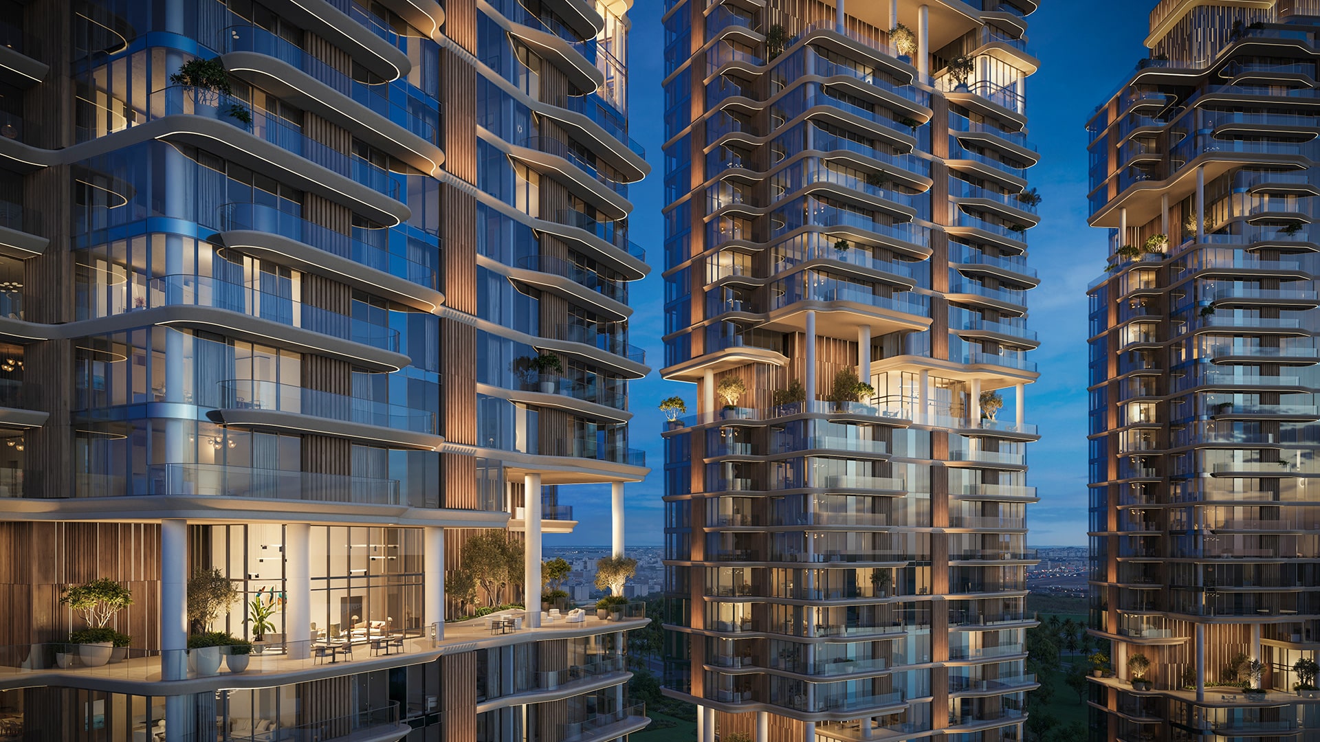 The Edit at d3 consists of three sculptural towers crafted with soft edges, filleted corners and continuous balcony lines. Elevated sky gardens carve dramatic recesses into the façade, merging greenery with the vertical structure. The towers balance bold presence and quiet elegance, maintaining a harmonious dialogue between city, water and nature. Interiors highlight meticulous craftsmanship, natural finishes and flowing layouts that elevate light and space.